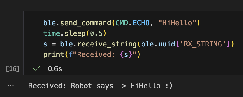 Solution: Implemented ECHO command handler that receives a string, adds prefix “Robot says -> “ and suffix “ :)”, then sends back via BLE. Tested by sending “HiHello” and successfully received “Robot says -> HiHello :)”.