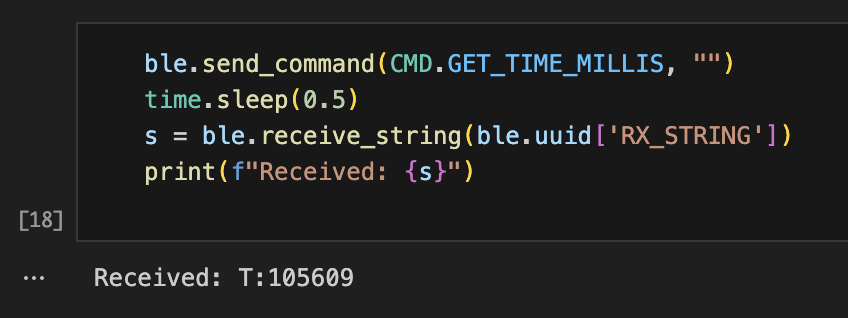 Solution: Implemented command handler that formats time as T:timestamp using millis() function and sends via BLE characteristic. Successfully tested with response format “T:105609”.
