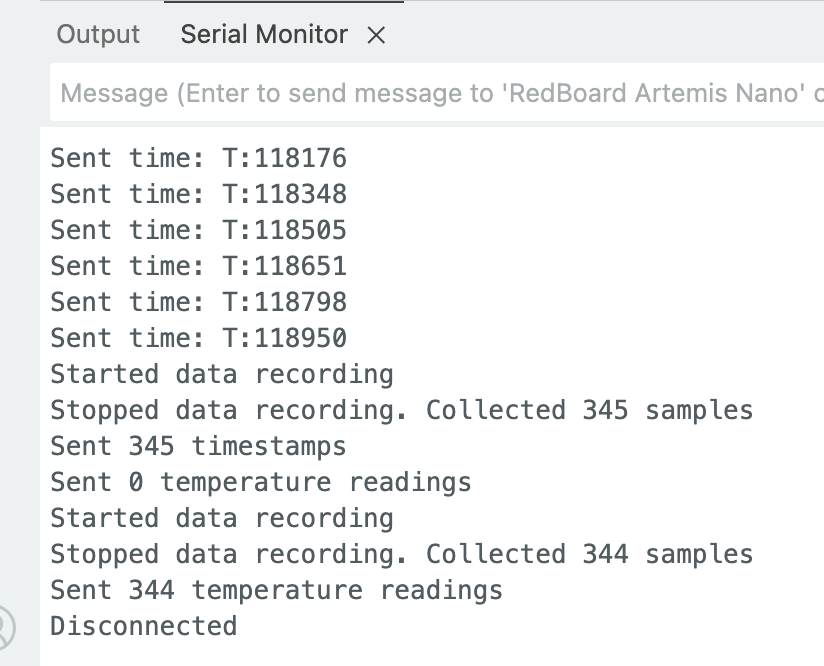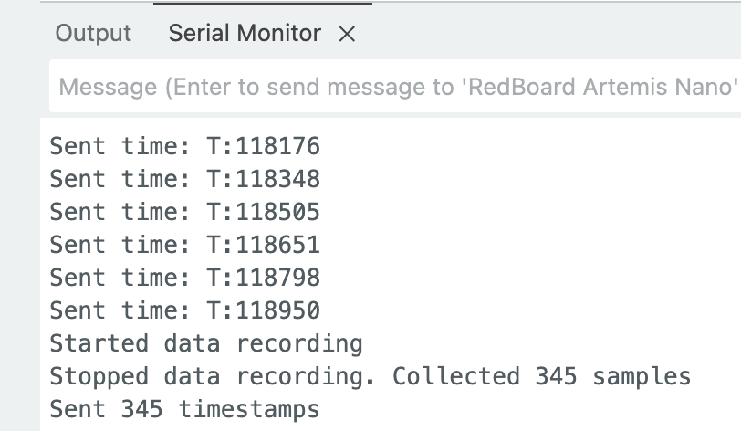 Solution: Created global arrays (timeStamps[1000]) and implemented START/STOP recording commands. Data is collected every 10ms in the main loop when recording is enabled. The SEND_TIME_DATA command loops through the array and transmits all stored timestamps.