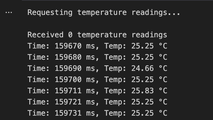 Solution: Extended Task 6 by adding temperature array. Both timestamp and temperature are collected simultaneously using getTempDegC(). Data is sent as combined string format T:12345|C:33.25 for easy parsing.