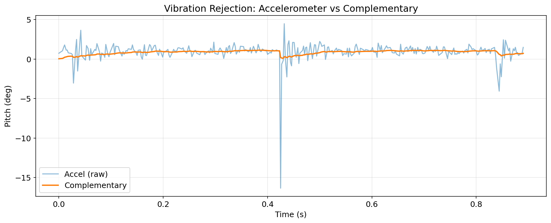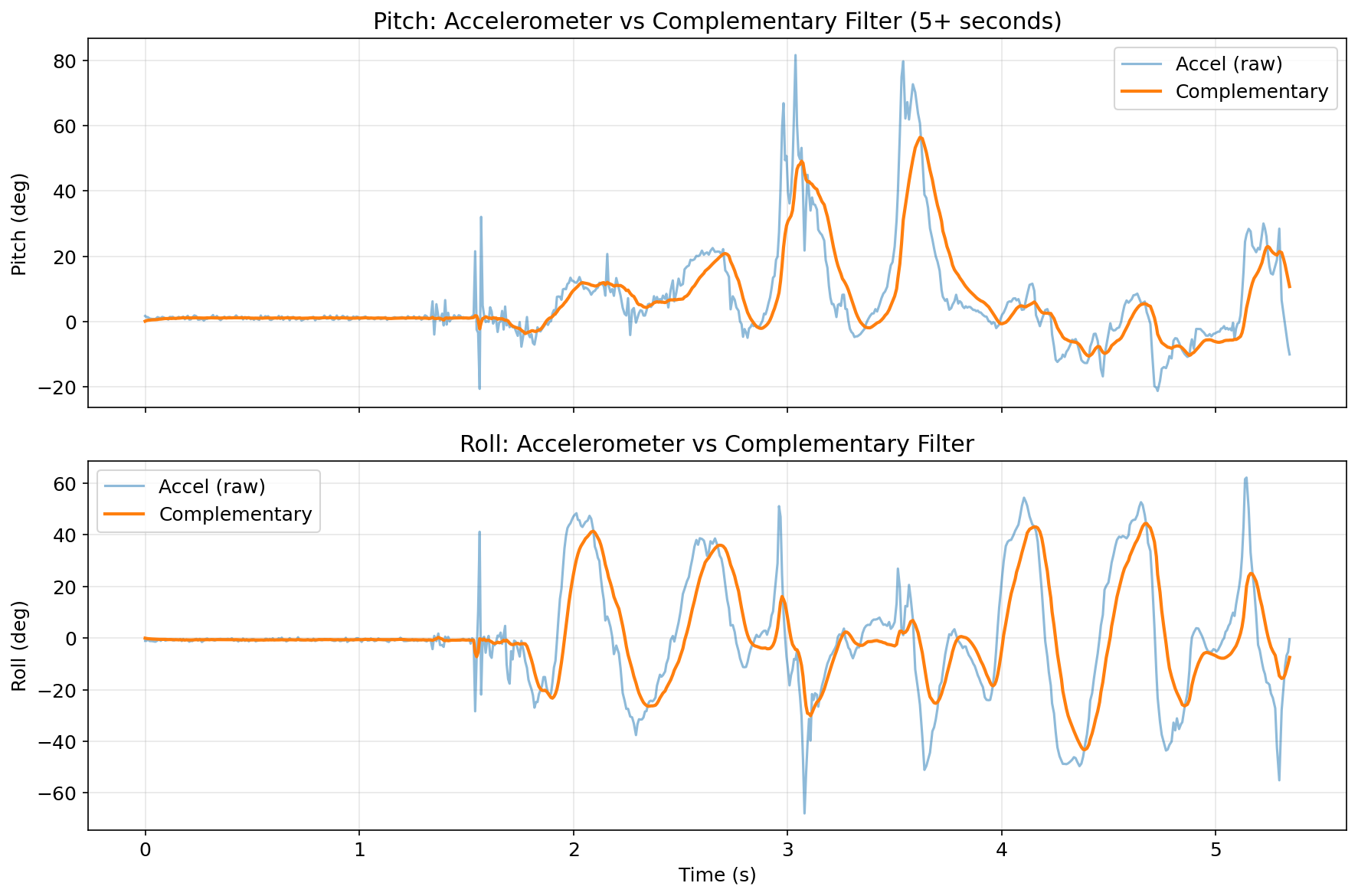 The raw accelerometer spikes by several degrees during each tap. The complementary filter’s dominant gyroscope weight (95%) suppresses these transients, maintaining a smooth output.