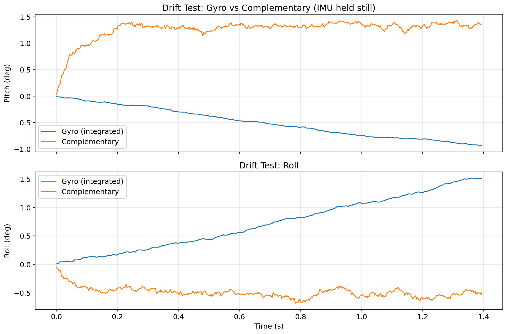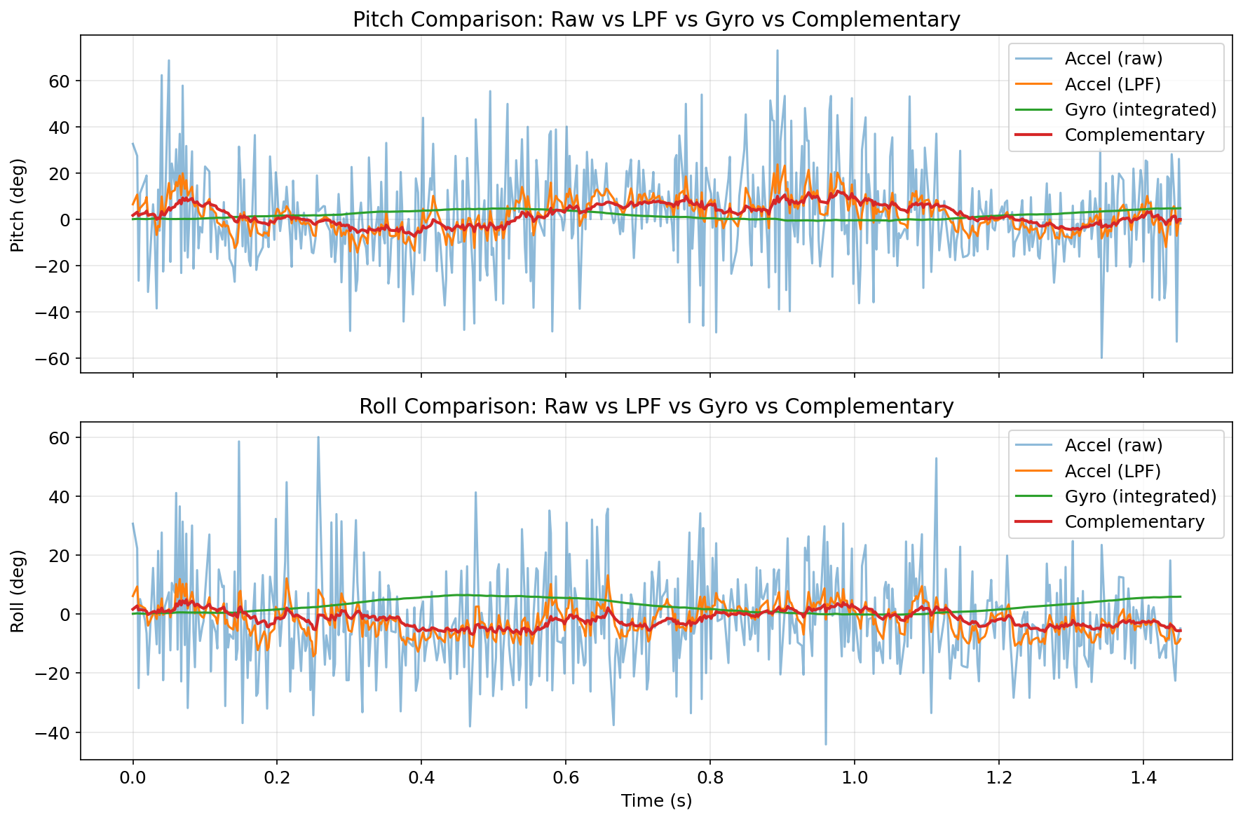 The gyro integral drifts continuously; the complementary filter stays within ~1° of the true angle because the 5% accelerometer weighting slowly corrects any accumulated bias.