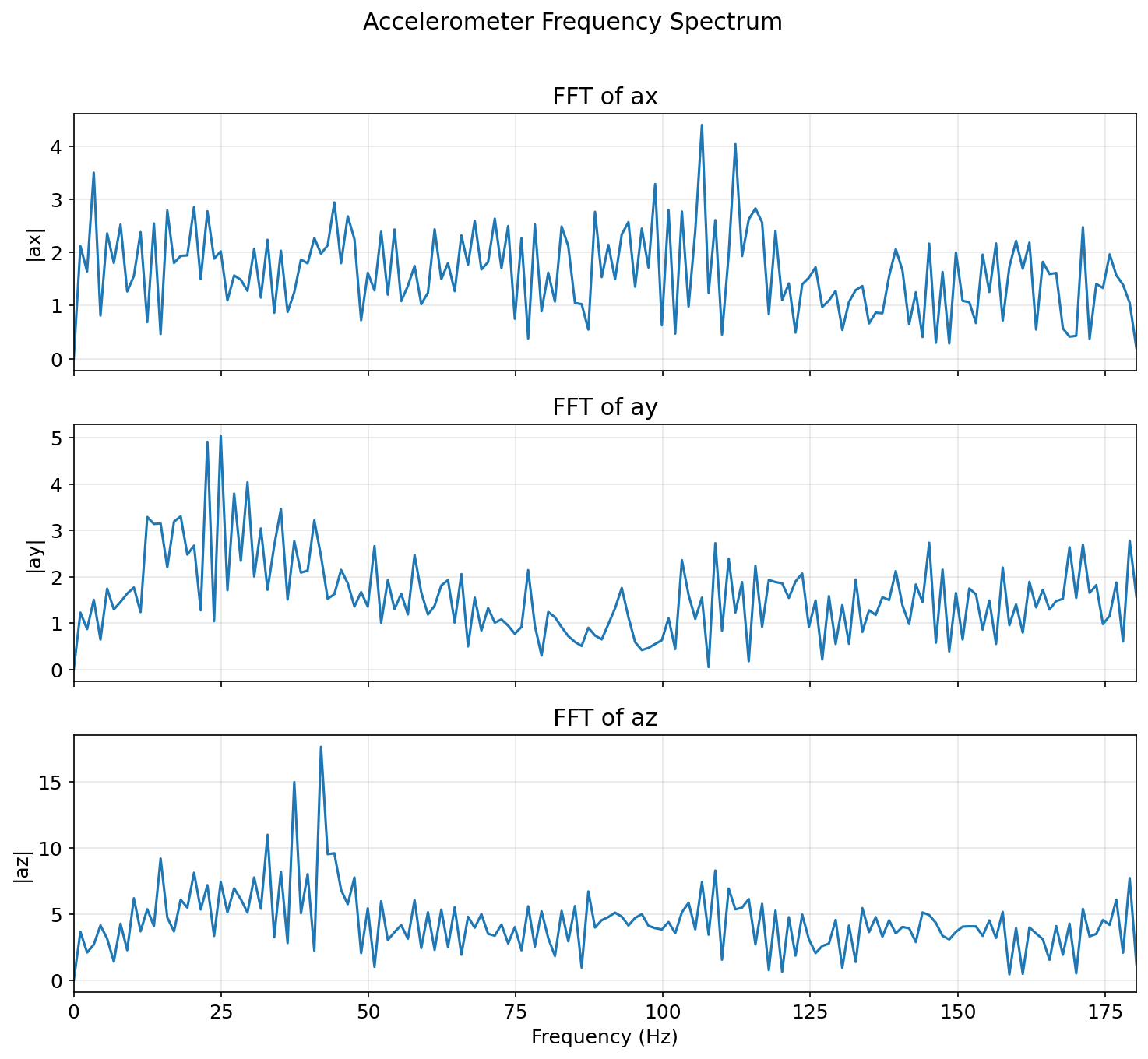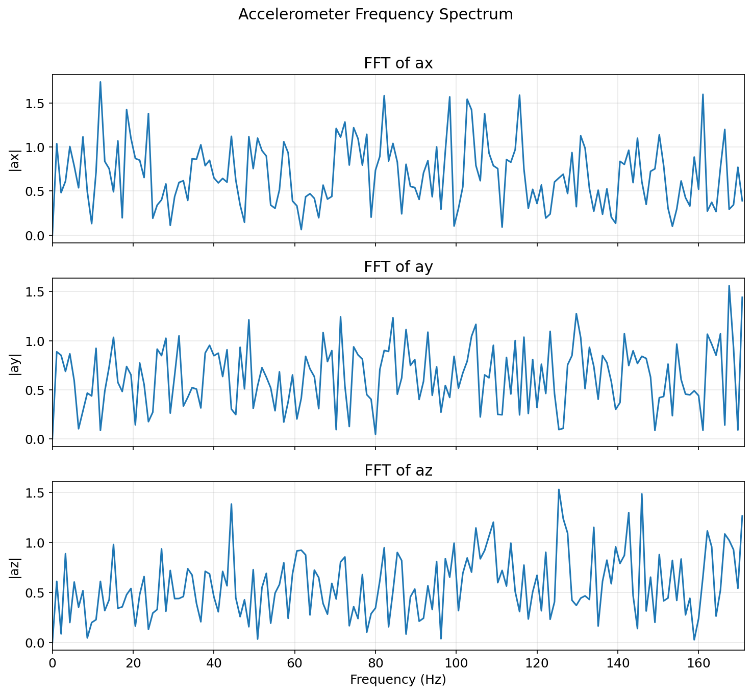 FFT analysis was performed on stationary accelerometer pitch data (sampling rate ≈ 342.7 Hz, Nyquist ≈ 171.4 Hz):