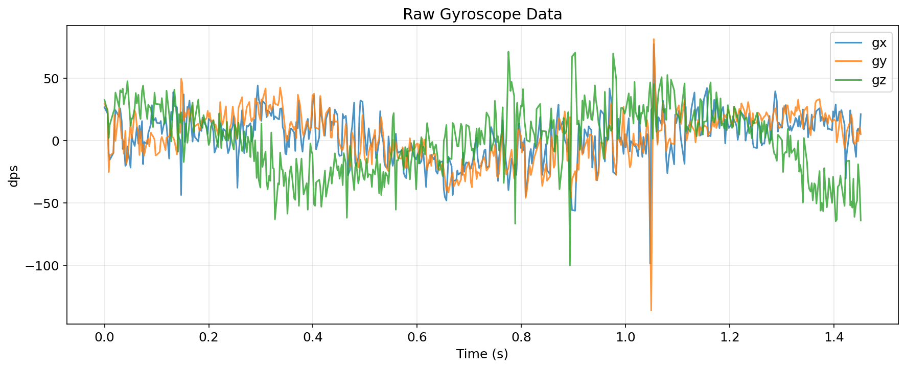 The gyroscope outputs angular velocity (dps), so integrating over time gives angle estimates: