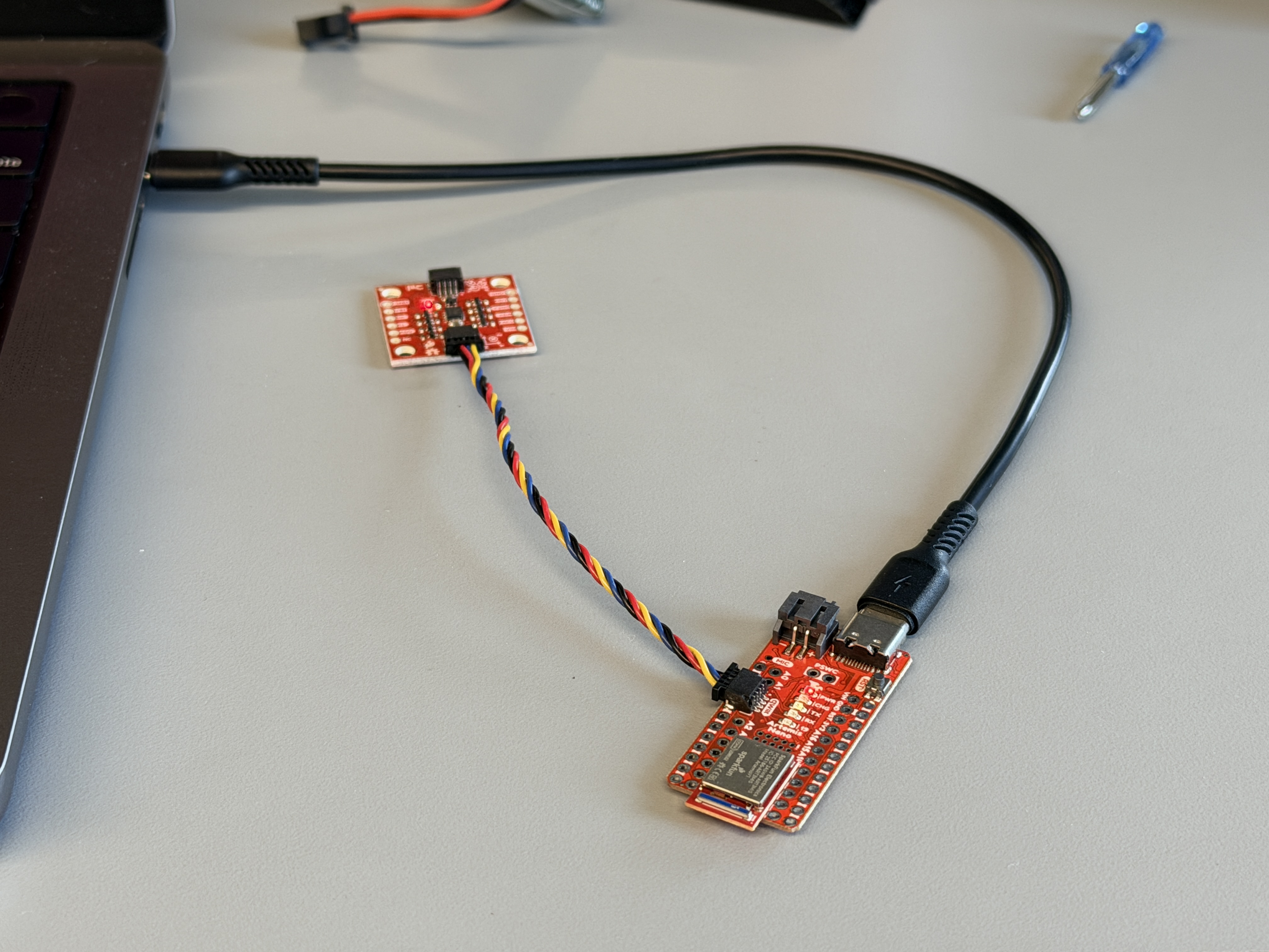 The ICM-20948 9-DOF IMU is connected to Artemis Nano via the QWIIC connector. QWIIC interface supplies 3.3V, GND, SDA and SCL.