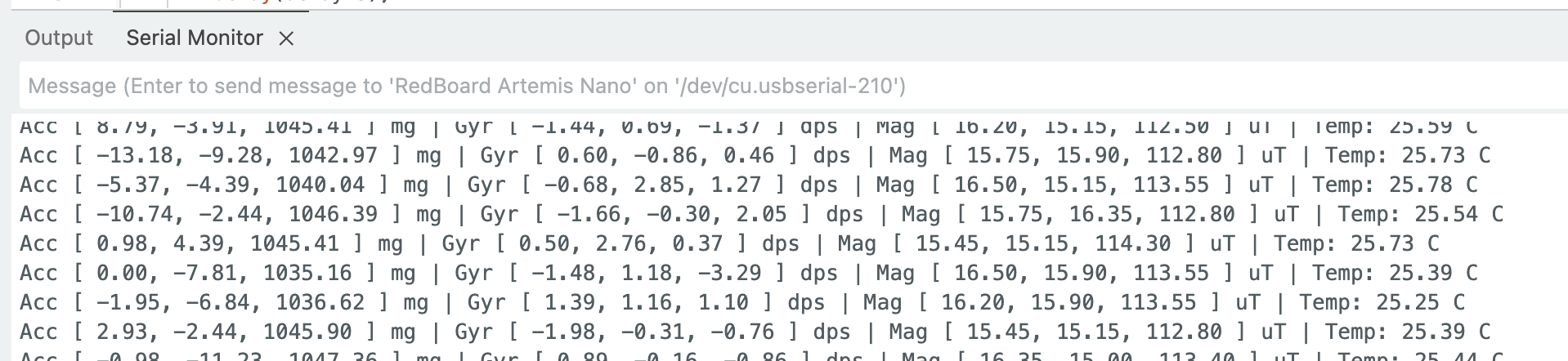 After running the Example1_Basics sketch, the Serial Monitor confirmed successful initialization, and both accelerometer and gyroscope readings updated in real time: