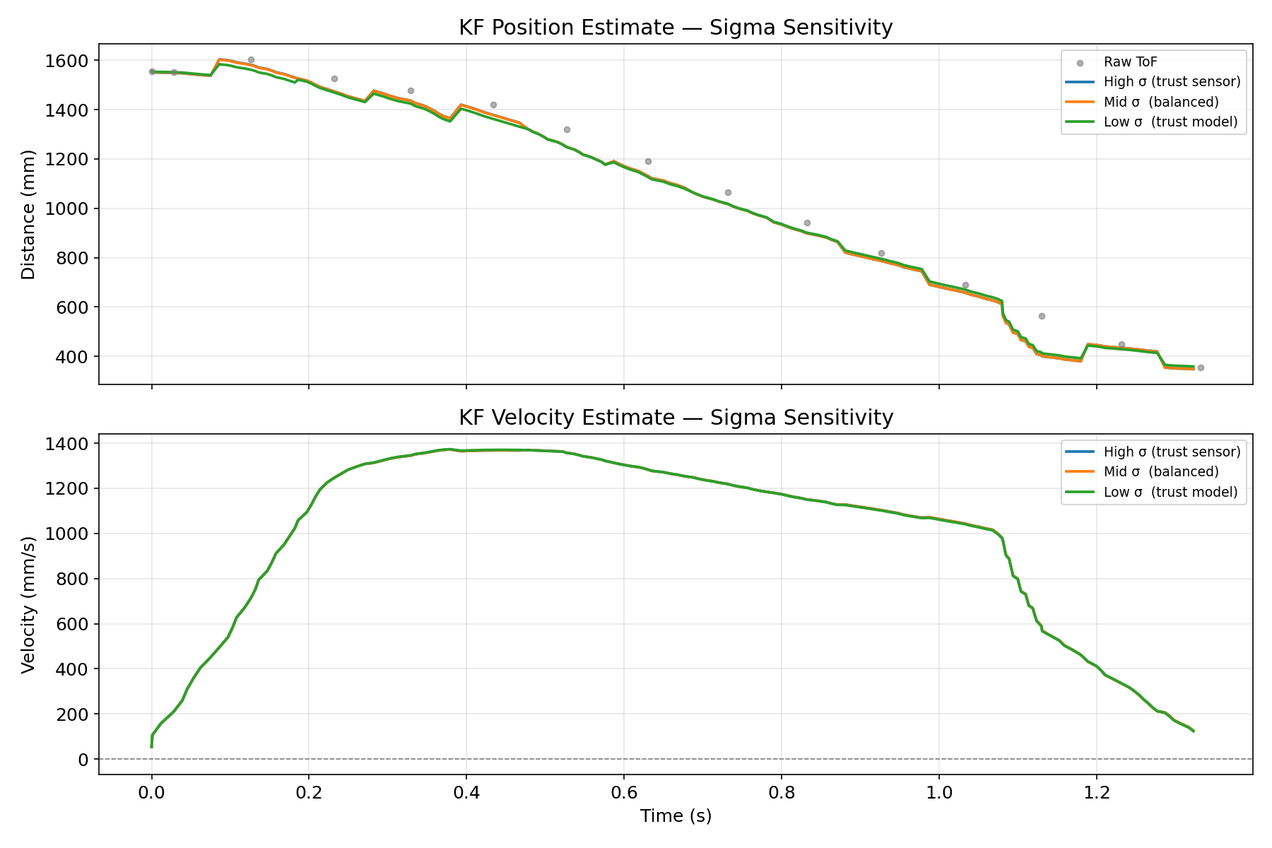 This cannot really see from the figure since the difference are not that huge, but based on result I read: High process noise (sigma1=sigma2=500) makes the estimate chase every measurement closely. Low process noise (sigma1=sigma2=10) locks onto the model and barely moves when a new reading arrives. The balanced setting (sigma1=sigma2=50) sits in between and follows the physics while still correcting for sensor drift. I kept sigma3=20 for all three since the ToF noise is a physical property of the sensor.