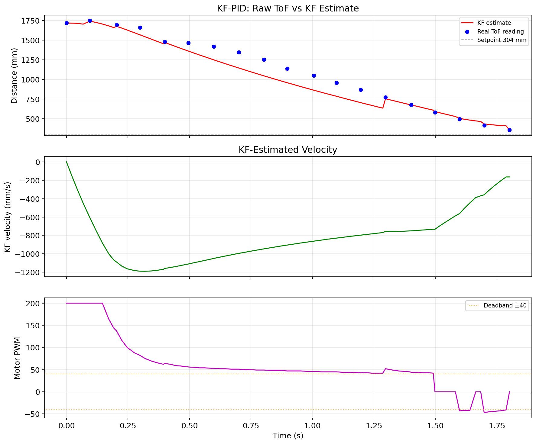 Out of 84 logged KF debug frames, 19 used a real ToF measurement and 65 ran prediction only. That is 77% pure prediction, confirming the KF is doing real work rather than just passing through sensor values. The robot stopped at 251 mm against a 304 mm target, giving a final error of 53 mm.
