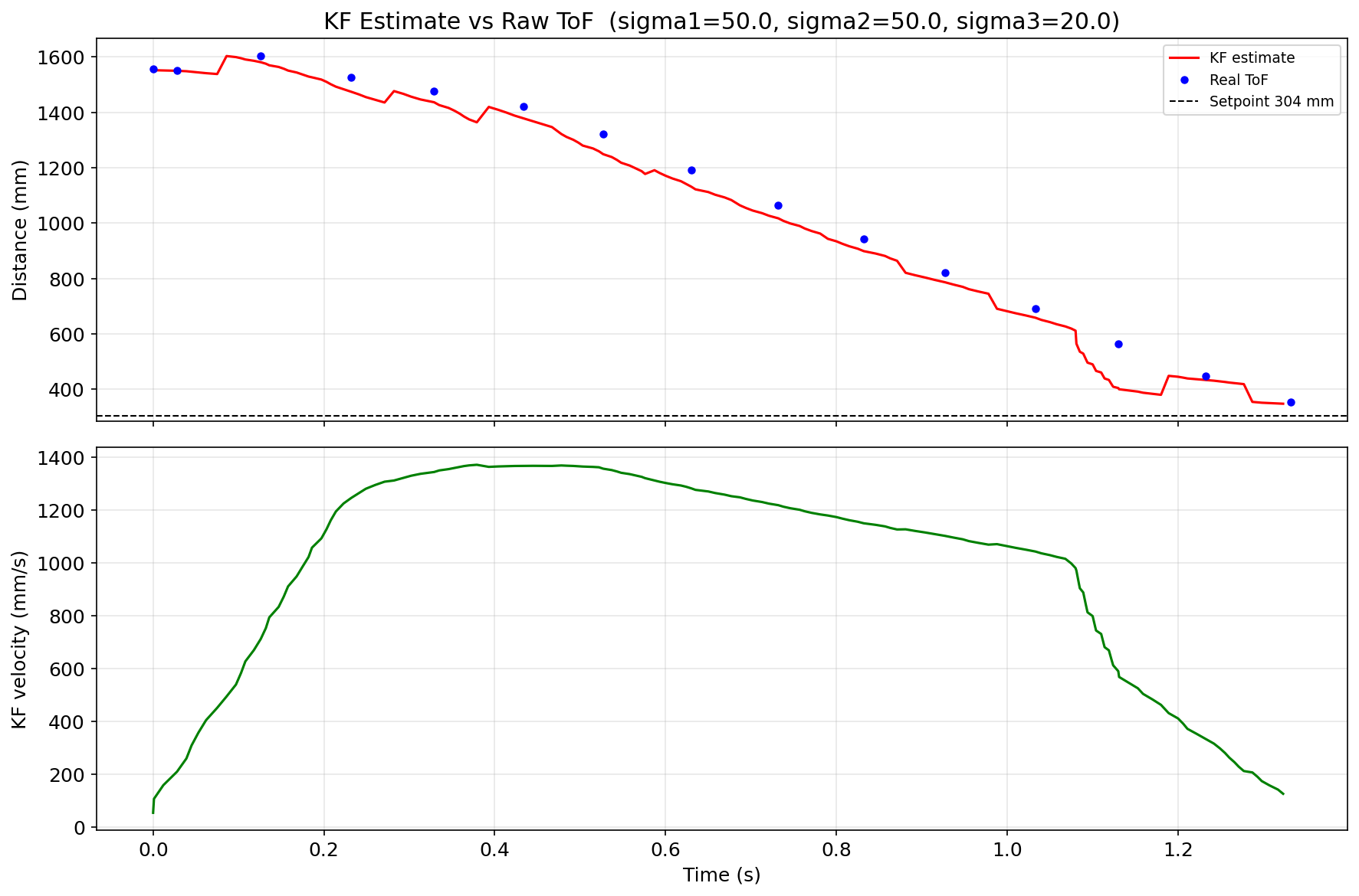 For the covariance matrices I set sigma1 = 50 mm, sigma2 = 50 mm/s, sigma3 = 20 mm. sigma1 and sigma2 are the standard deviations I assume for the model’s position and velocity uncertainty per step. sigma3 is the ToF measurement noise. With these values the filter weighs model predictions and sensor readings roughly equally.