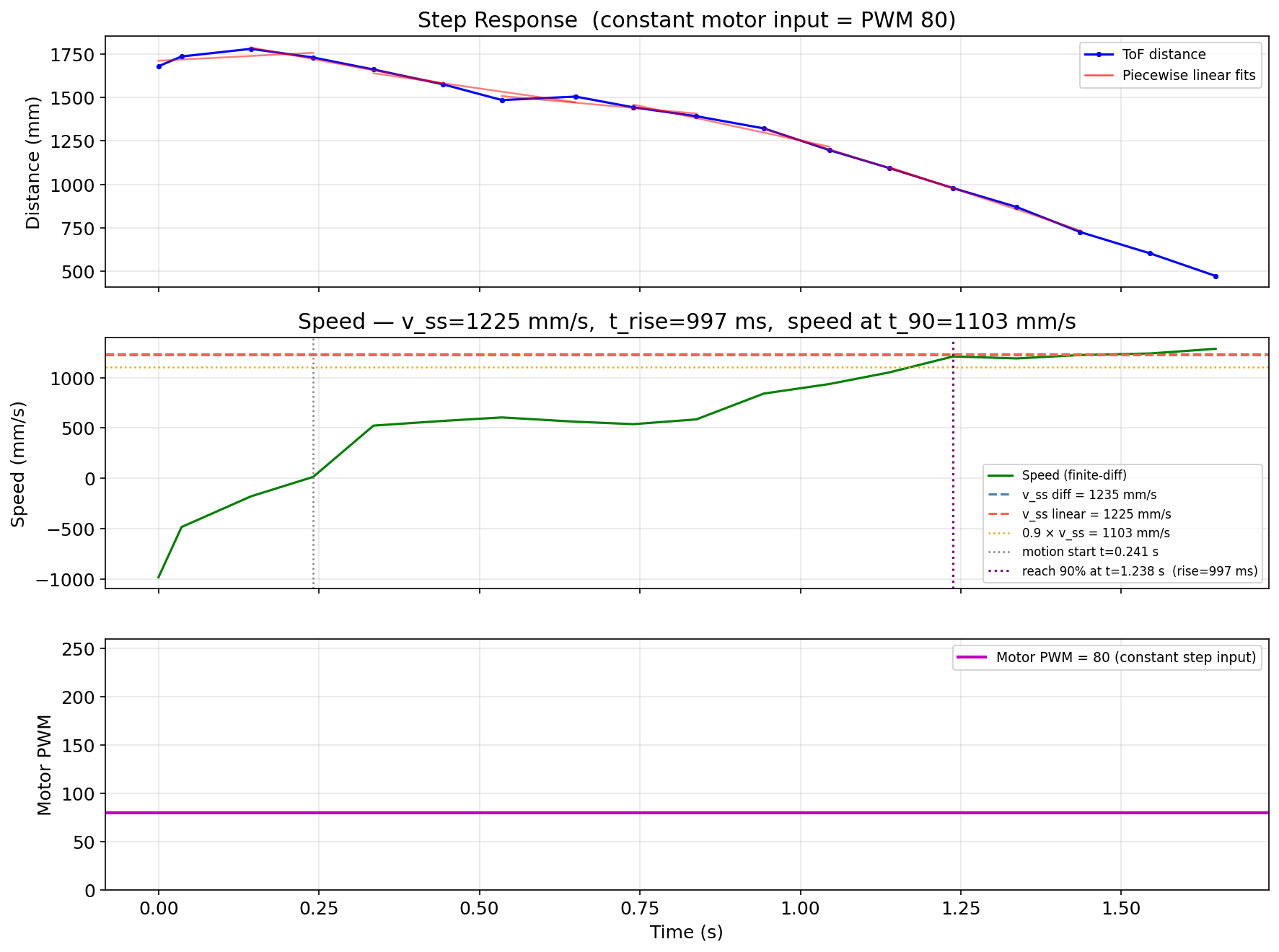 The top panel overlays piecewise linear fits on the raw distance data to show where the slope was measured. The bottom panel confirms the motor input was a constant step at PWM 80 throughout the run. From the velocity curve I extracted two estimates of steady-state speed. The finite-difference method gave 1235 mm/s, and piecewise linear fitting across 50%-overlap segments gave 1225 mm/s. They agree to within 1%, so I used the piecewise-linear result since it is less sensitive to noise spikes at individual ToF samples.